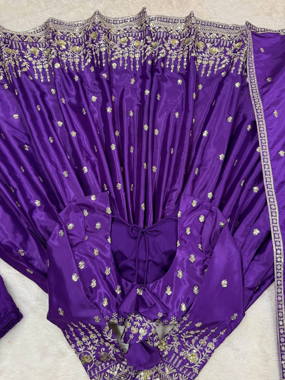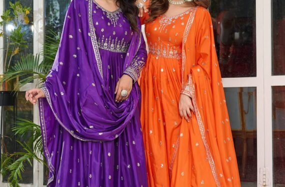 Be the first to review “Ambarika Orange and Purple Embroidered Anarkali set in American Silk”