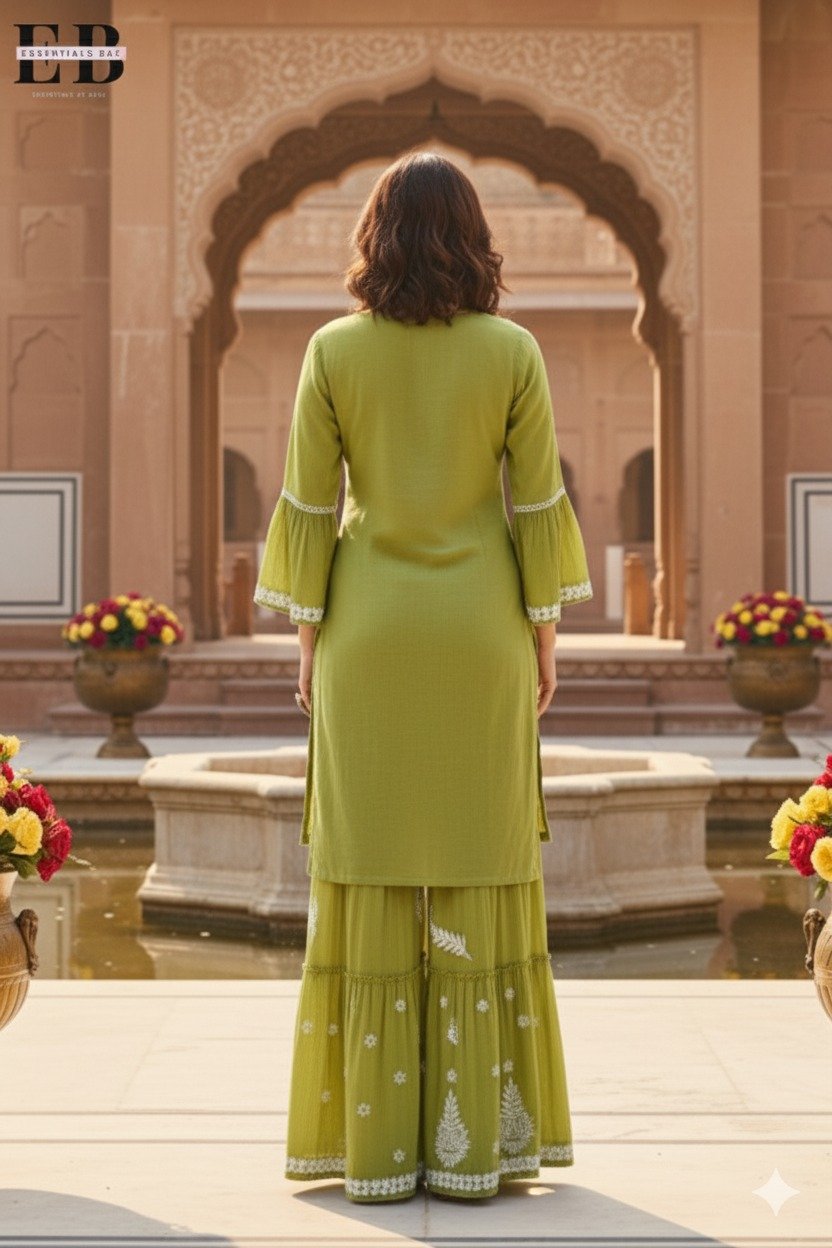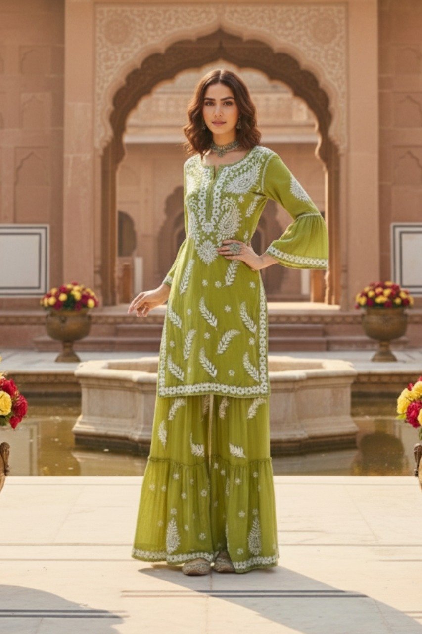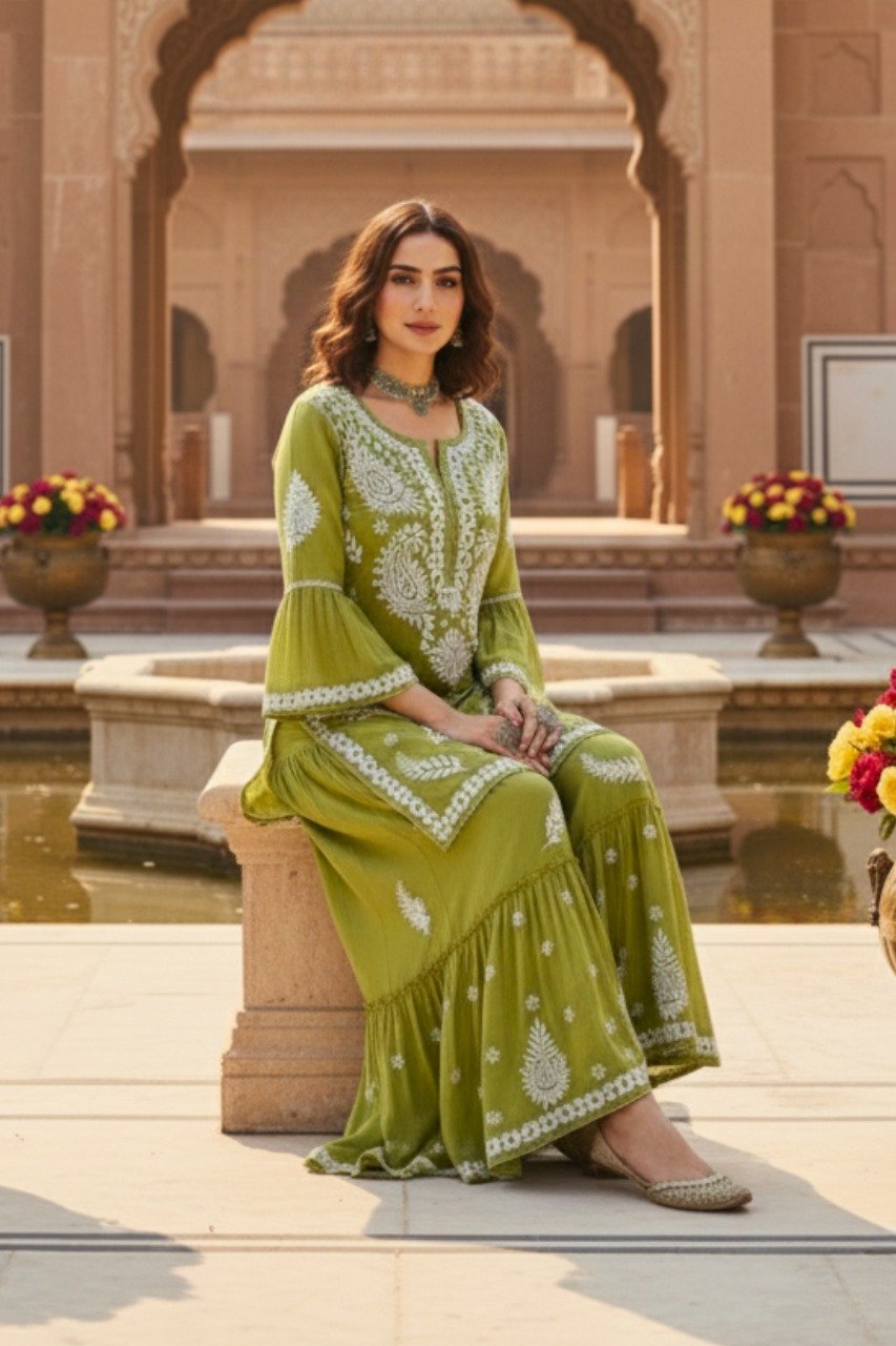 Beautiful Green Chikankari Kurta Sharara set Stitched