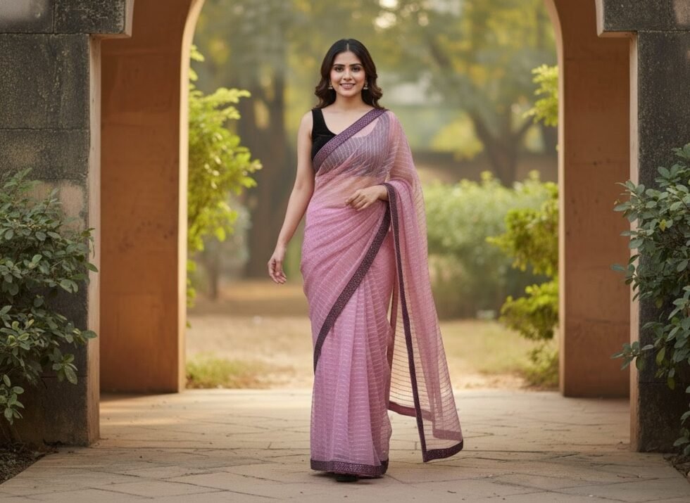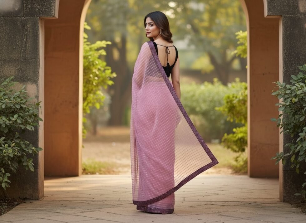 Beautiful Pink Net Saree with Black Velvet Blouse for Parties