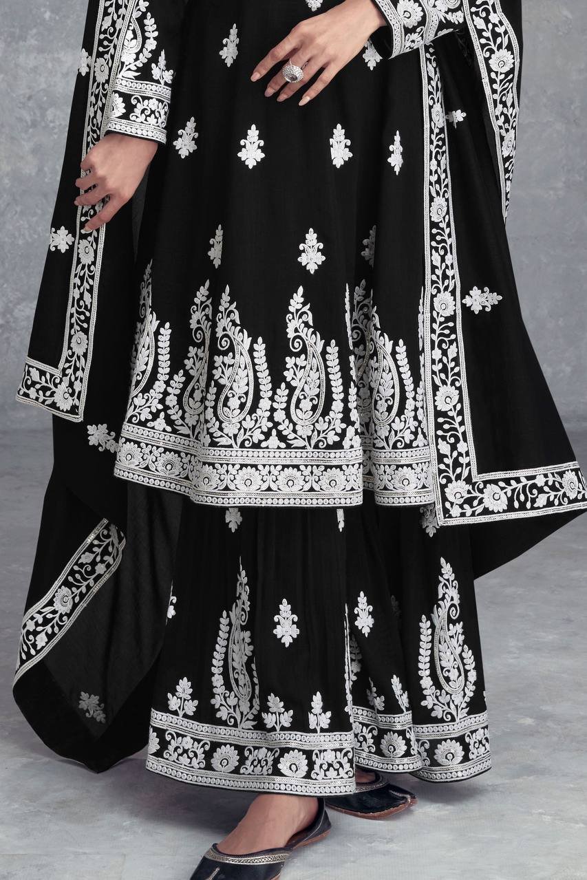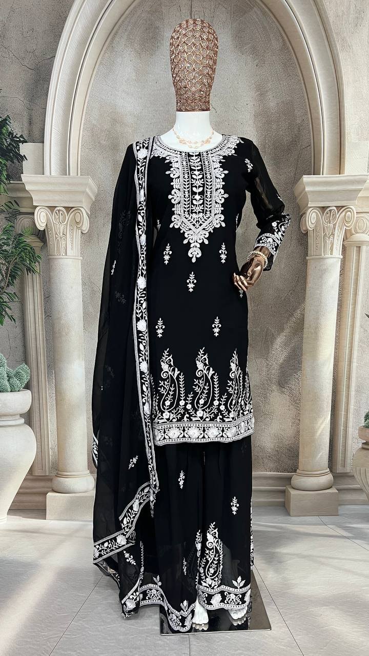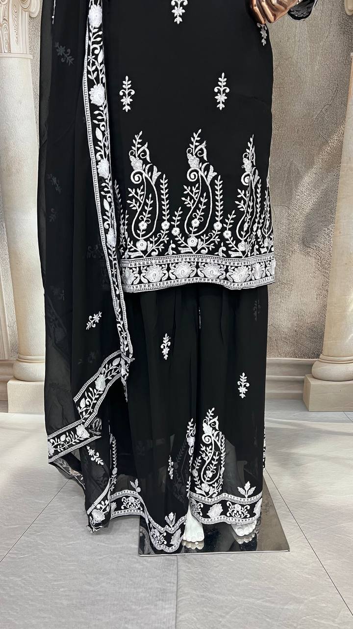 Ethnic Black Georgette Multi Needle Embroidered Kurta Sharara Set