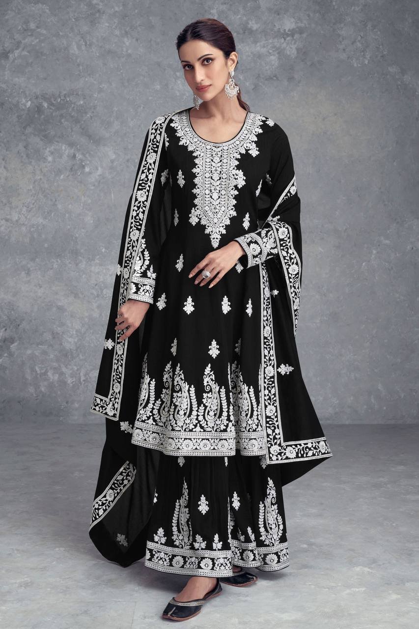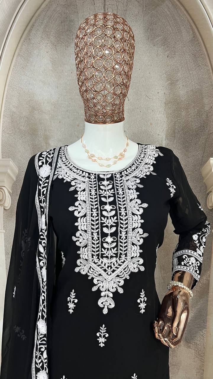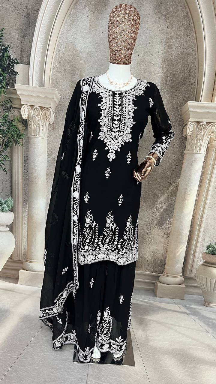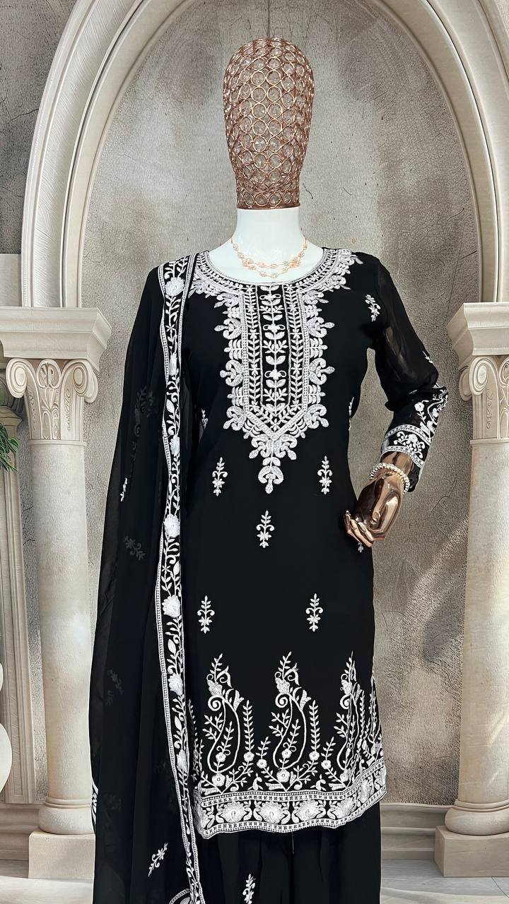 Ethnic Black Georgette Multi Needle Embroidered Kurta Sharara Set