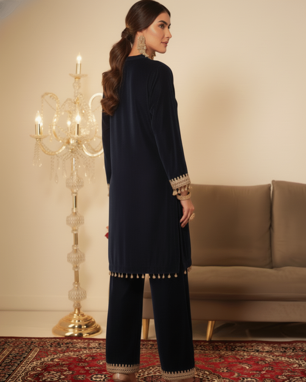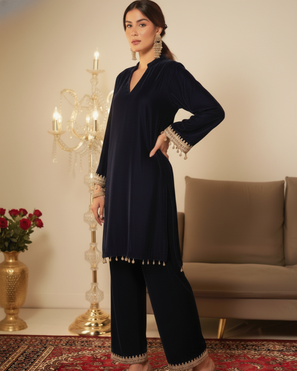 Be the first to review “Ethnic Navy Blue Designer 2 Pc Velvet Suit with Beautiful Gotta Lace Work for Parties”
