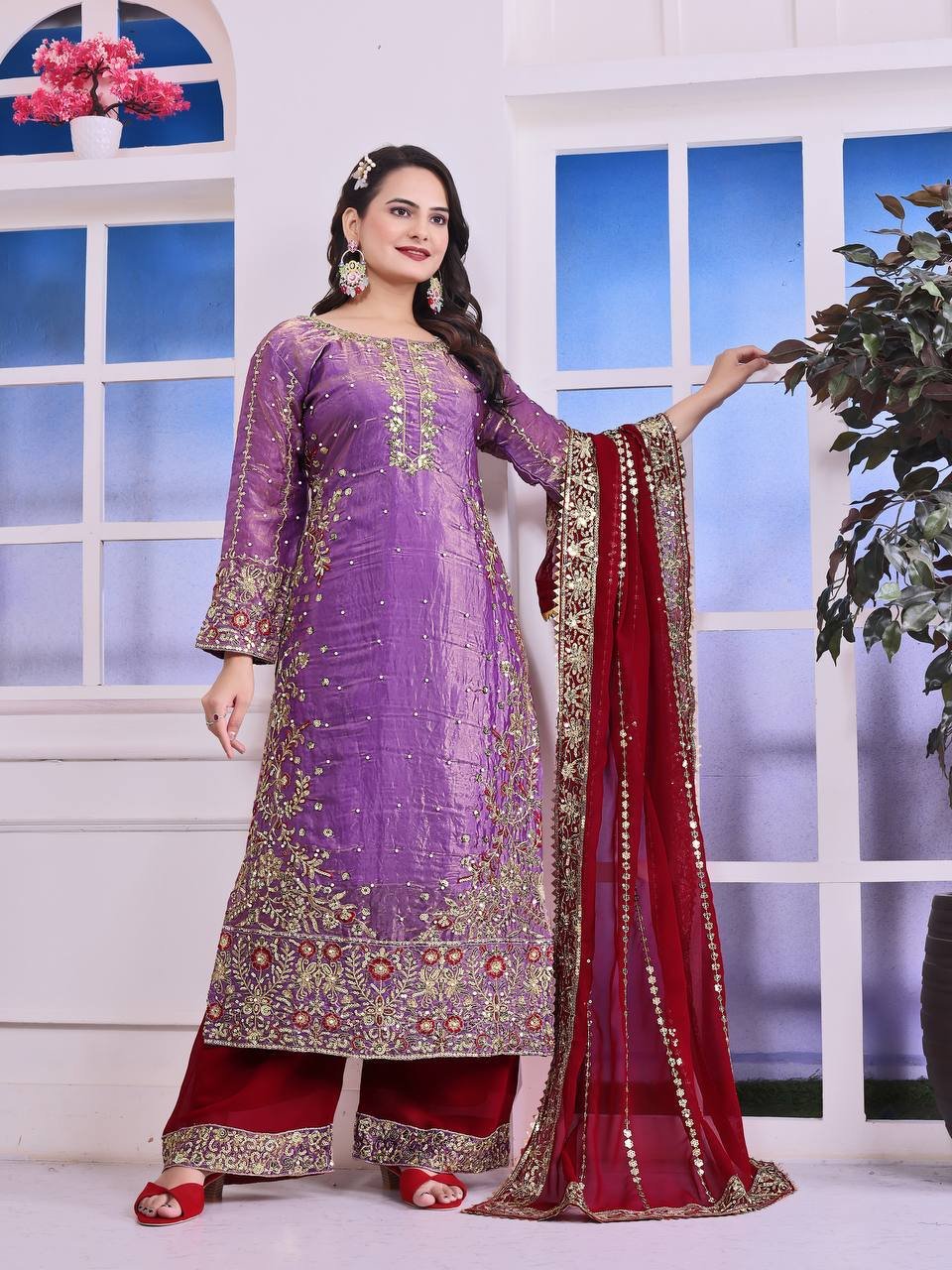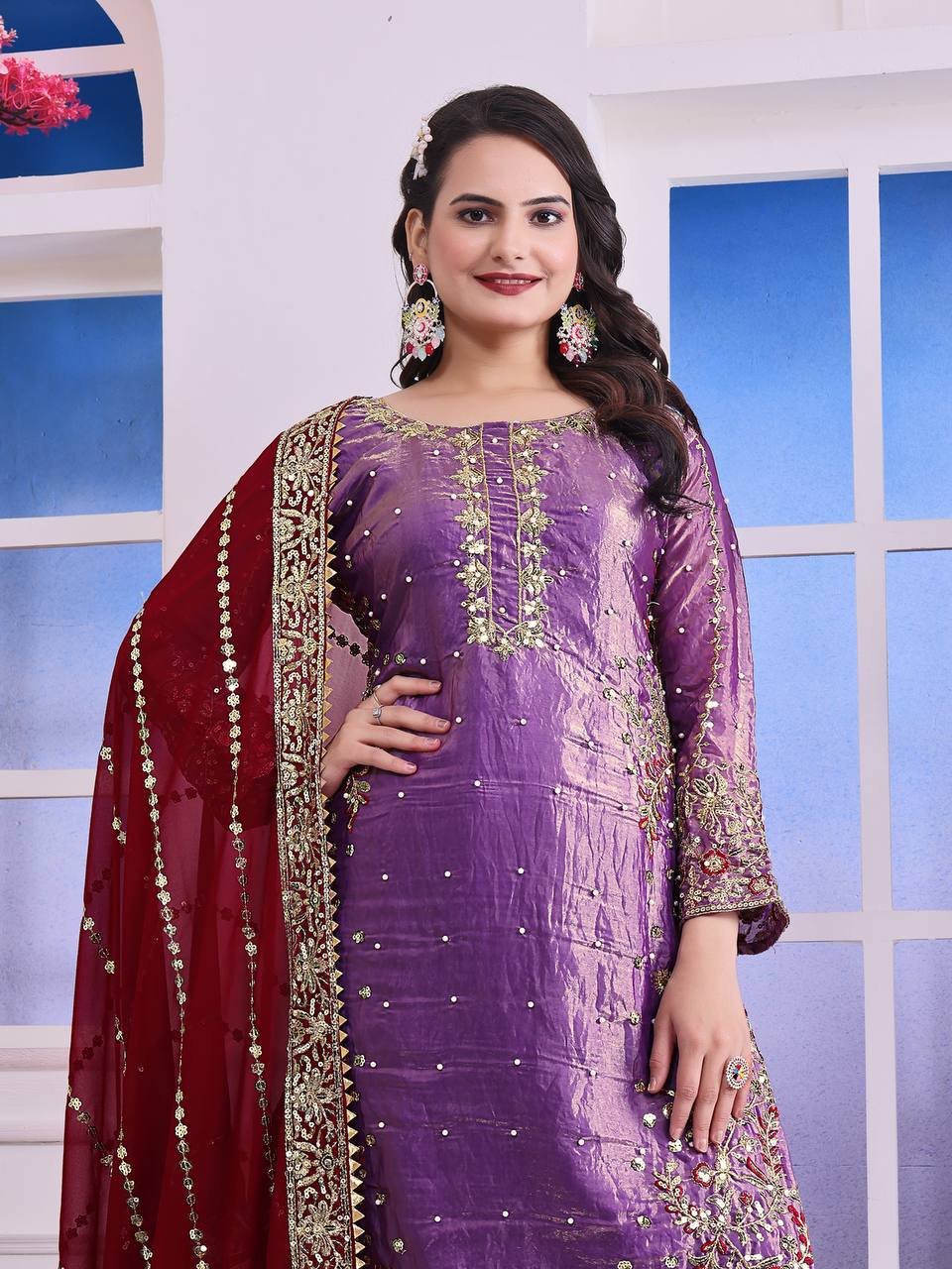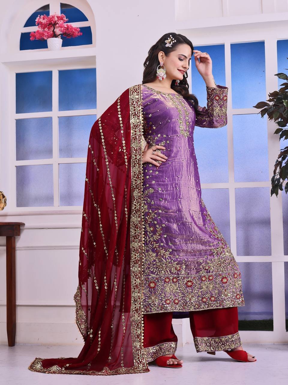 Fendy Silk Purple Embroidered & Moti Work Ethnic Palazzo Set for Festivals