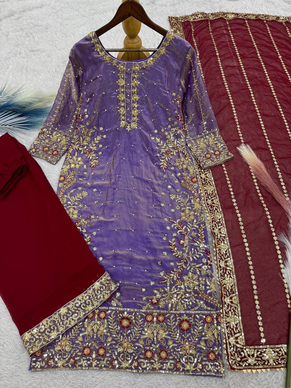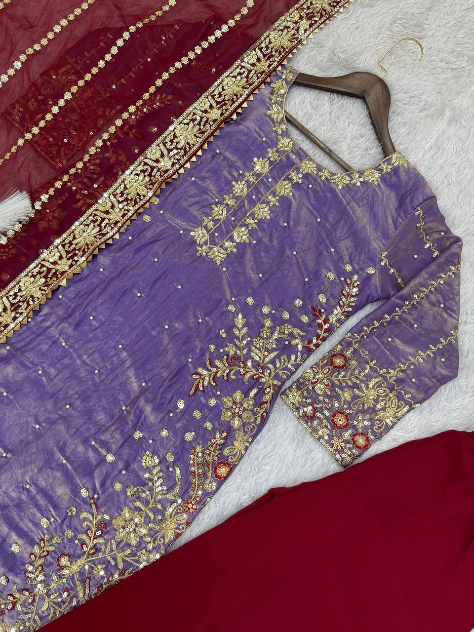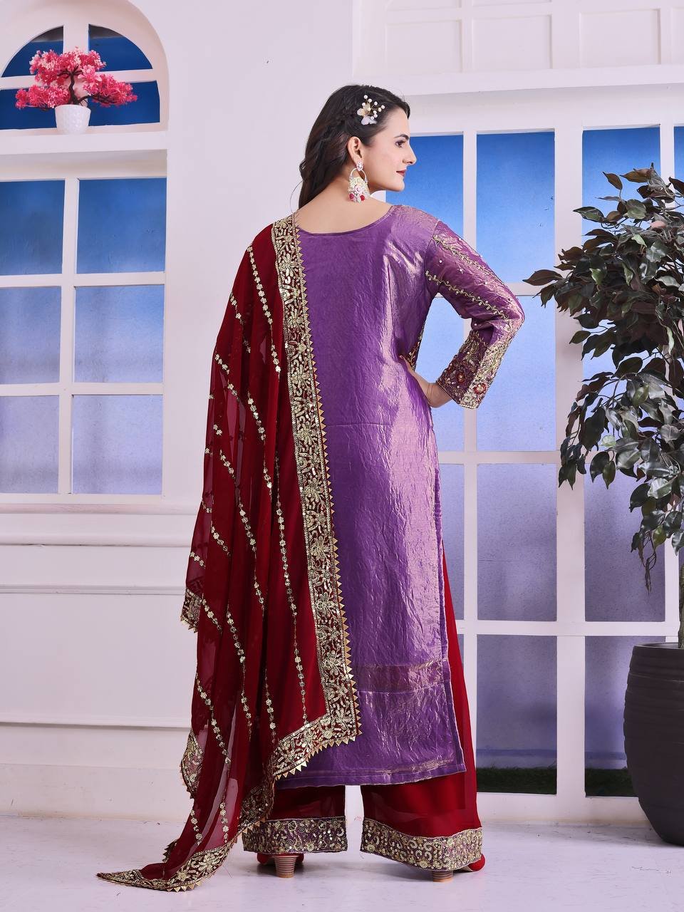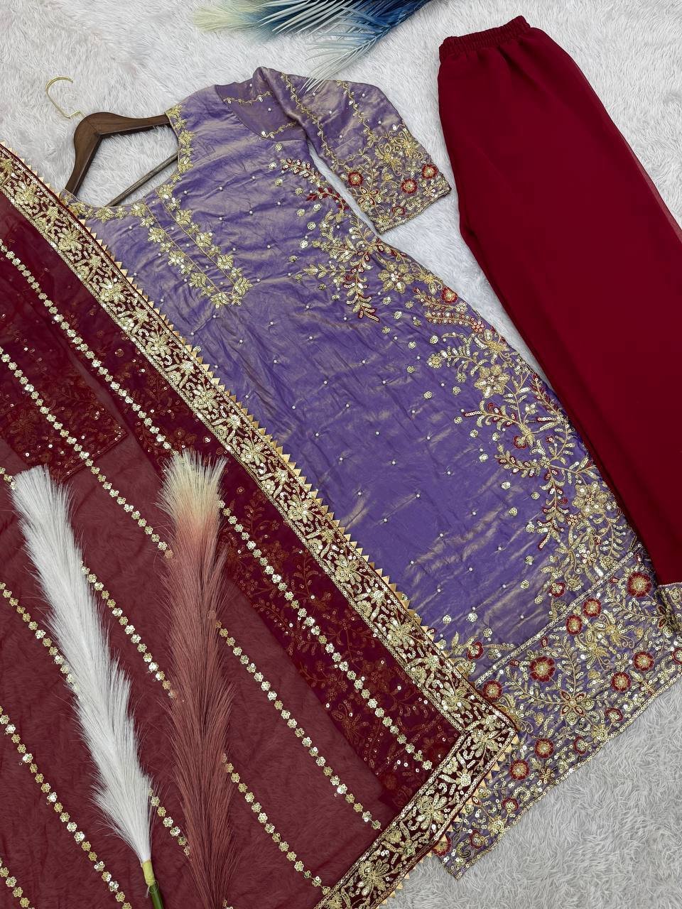 Be the first to review “Fendy Silk Purple Embroidered & Moti Work Ethnic Palazzo Set for Festivals”