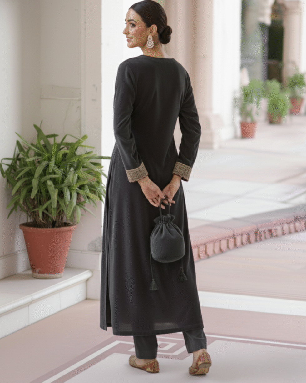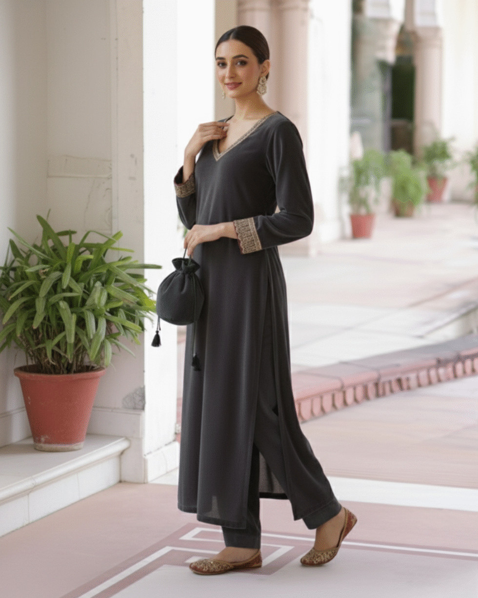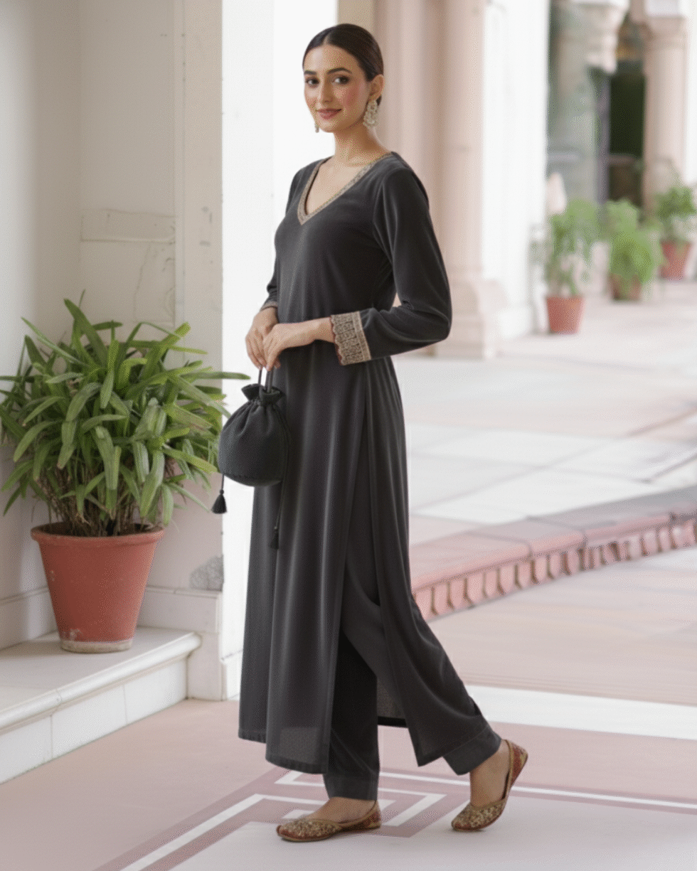 Be the first to review “Grey Velvet Straight-Cut Suit with Subtle Gotta Lace Work & Potli Bag”