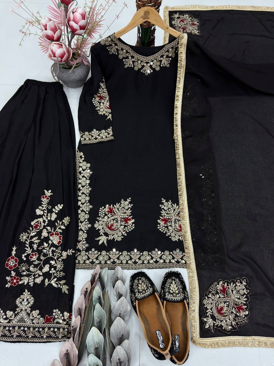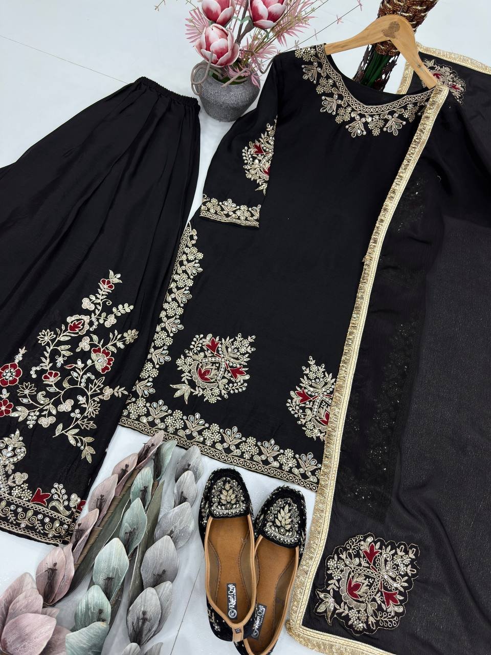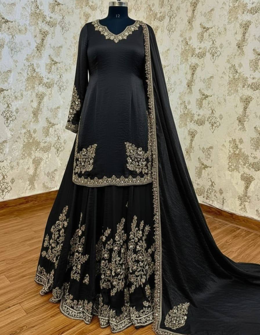 Ishira Black Chinon Silk Sequin Pearl & Mirror Work Top with Palazzo & Dupatta