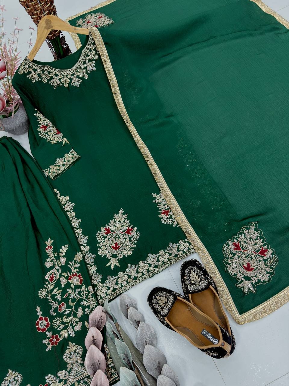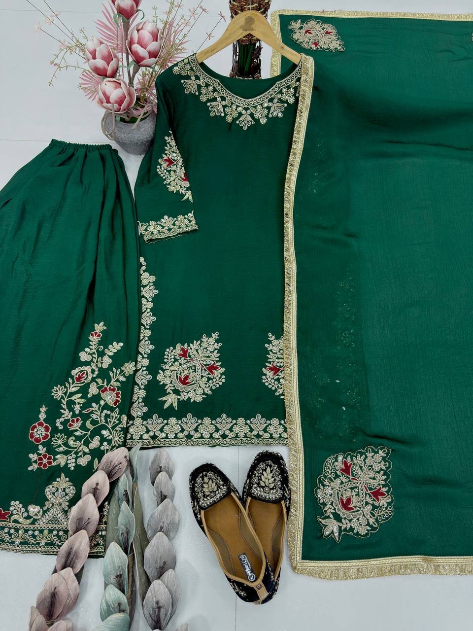 Ishira Bottle Green Chinon Silk Sequin Pearl & Mirror Work Top with Palazzo & Dupatta