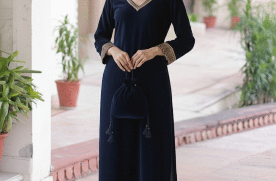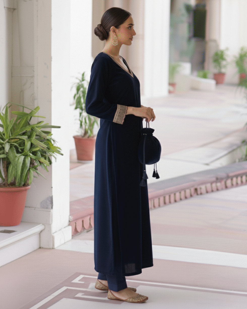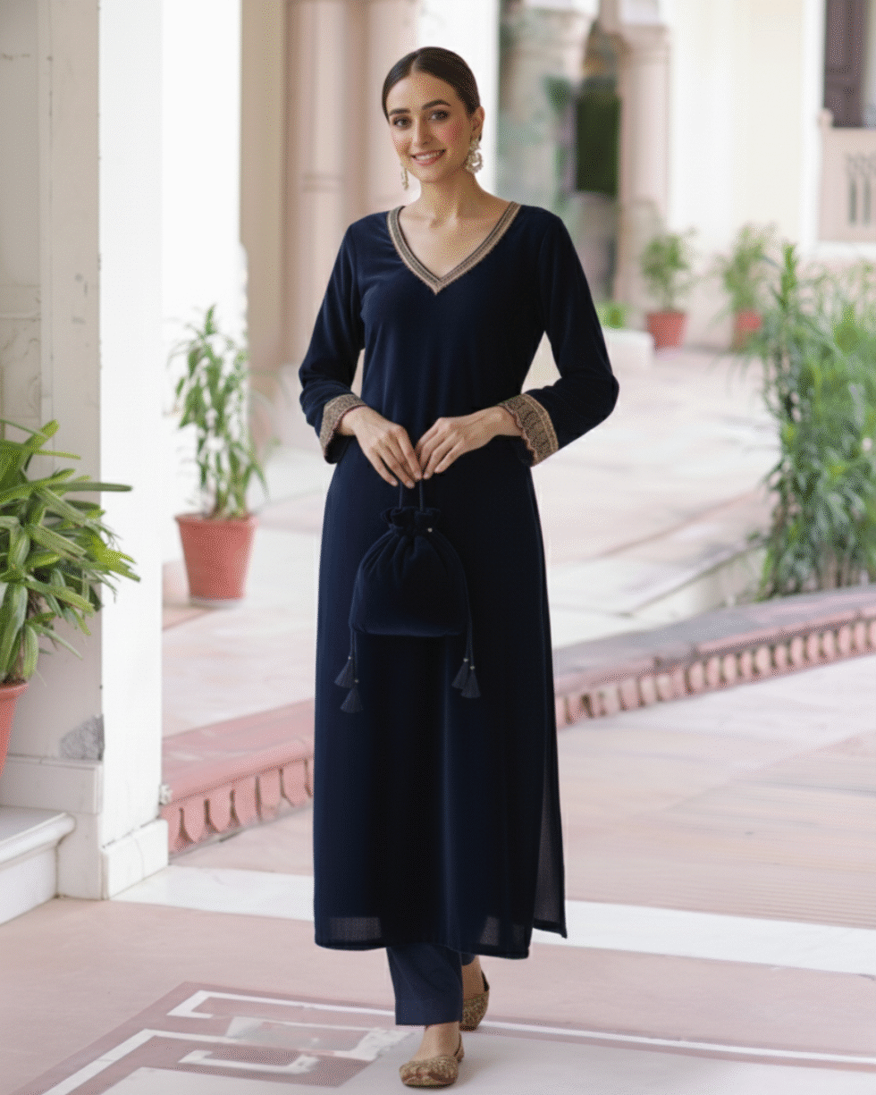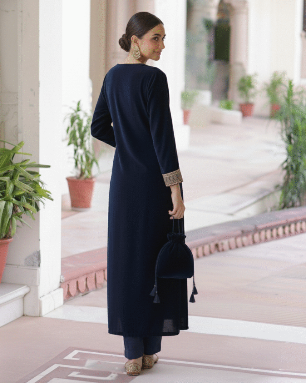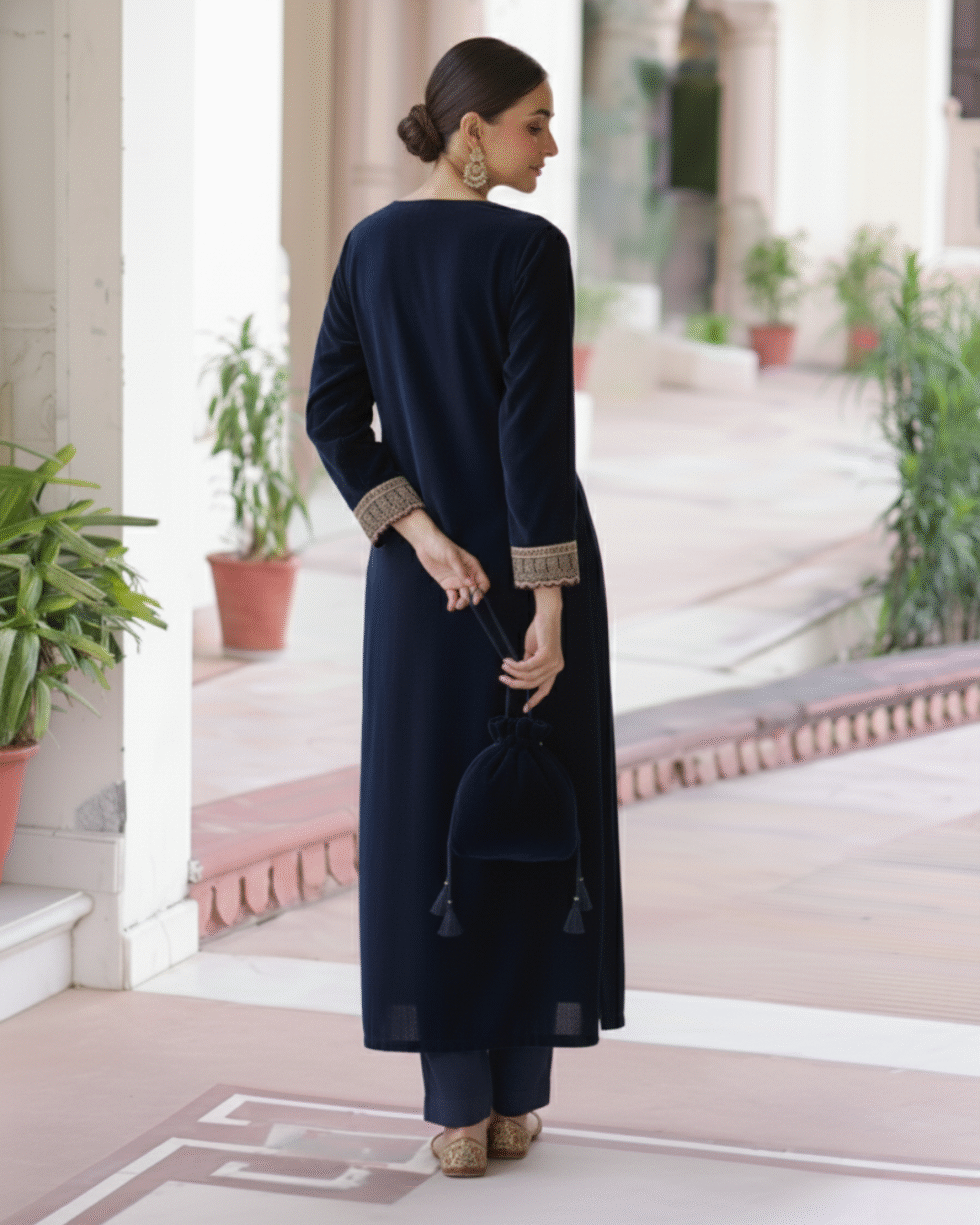 Be the first to review “Navy Blue Velvet Straight Kurta Set with Elegant Gotta & Potli Bag”