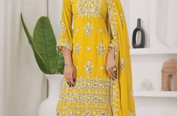 Be the first to review “Nishvini Yellow Georgette Embroidered Kurti Set with Palazzo & Sequins Dupatta”