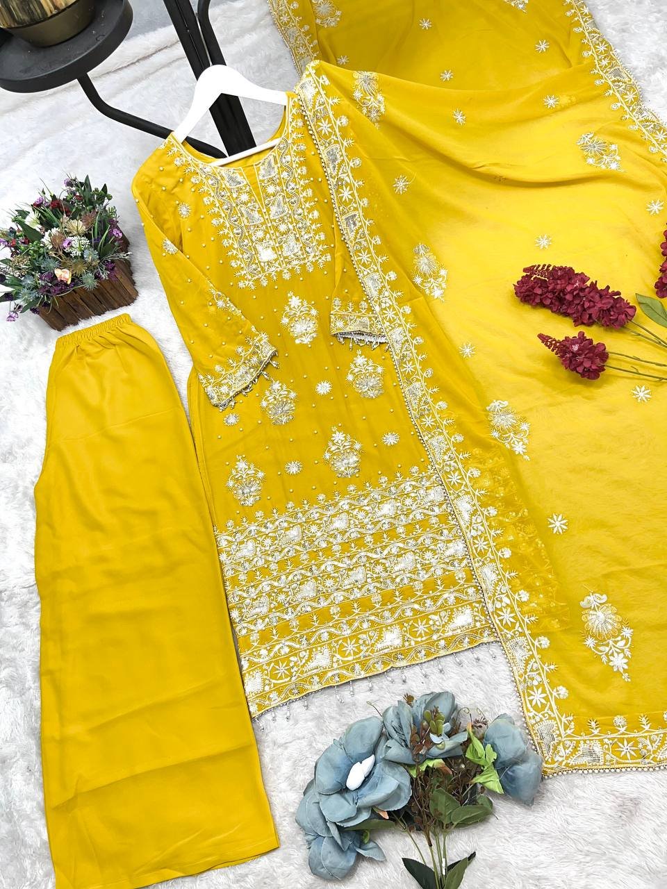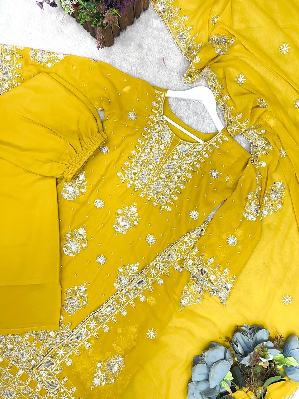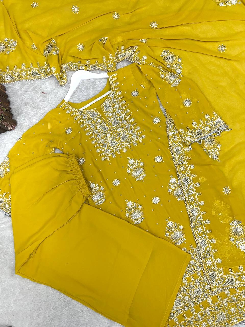 Nishvini Yellow Georgette Embroidered Kurti Set with Palazzo & Sequins Dupatta