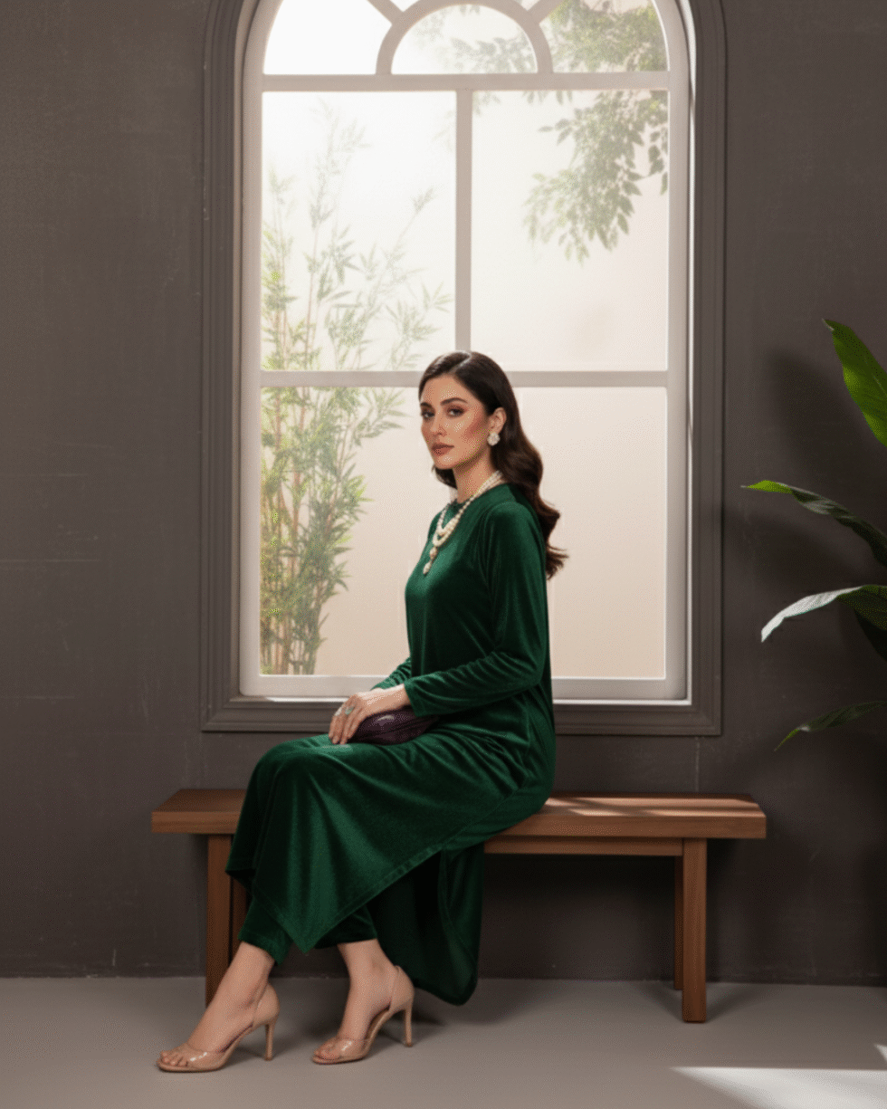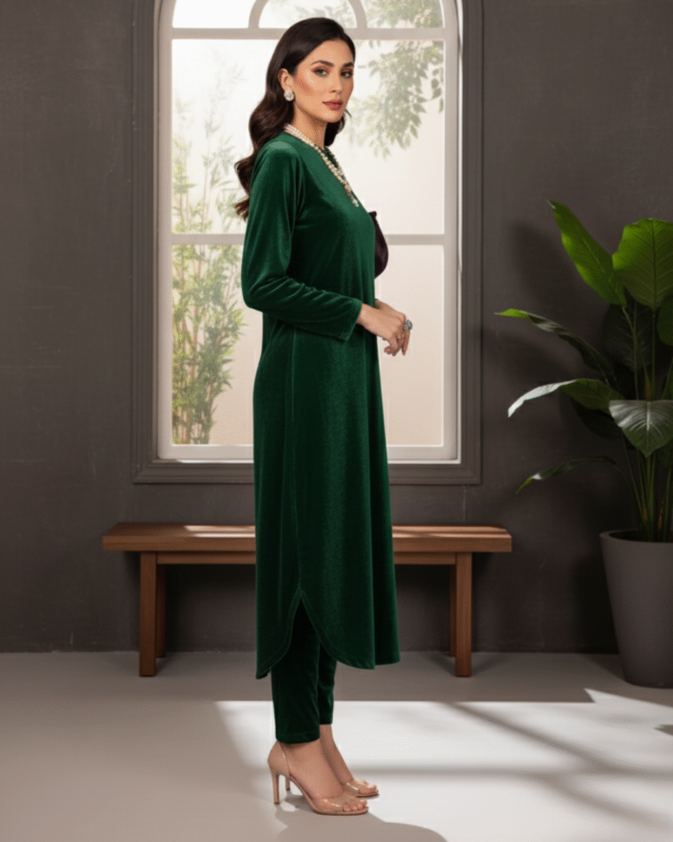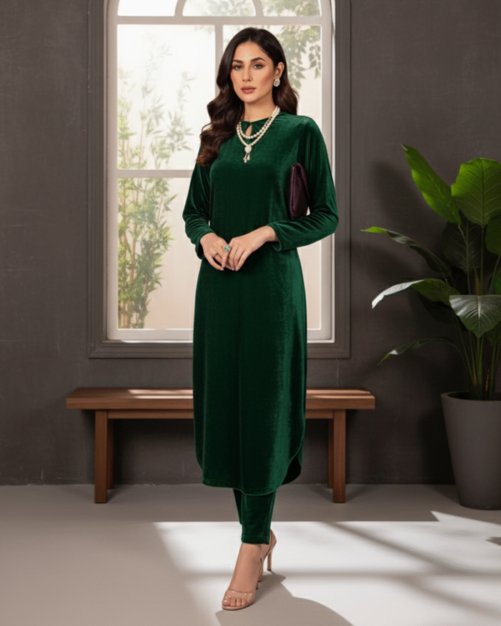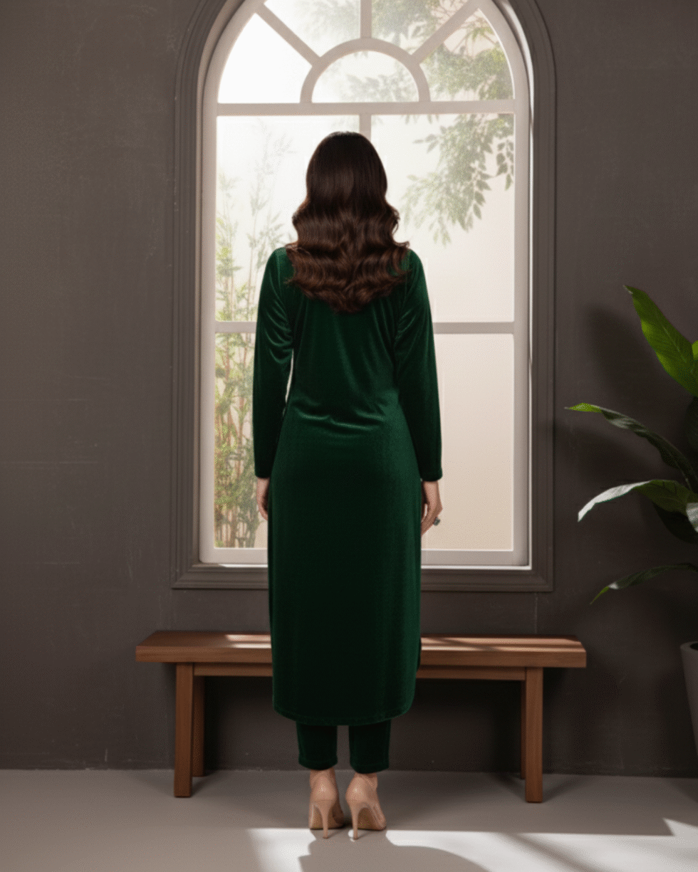 Be the first to review “Modest Premium Golden and Bottle Green Plain Velvet Long Straight Kurta Pant Set”