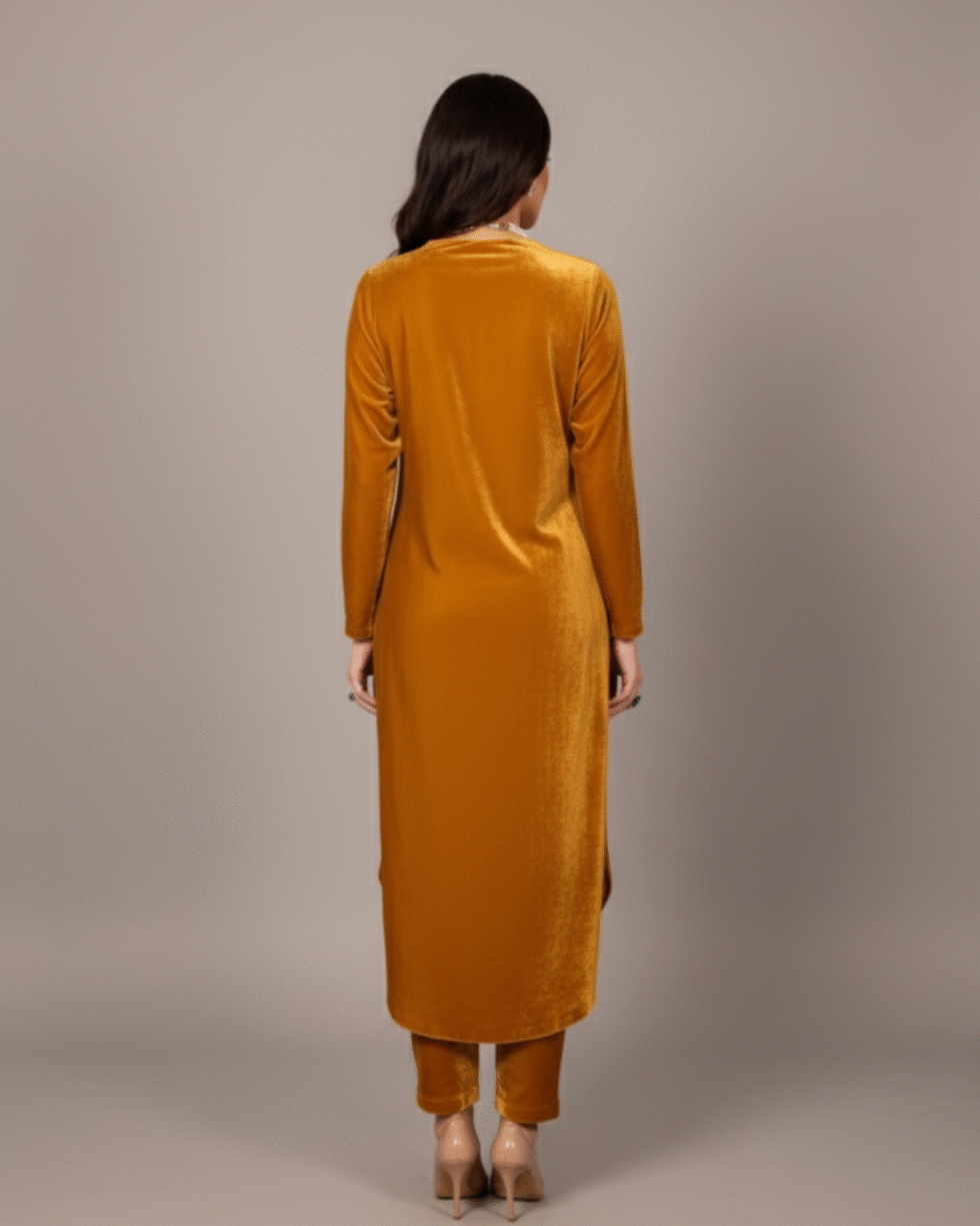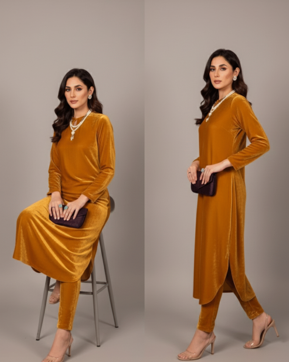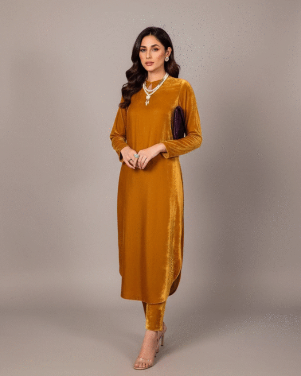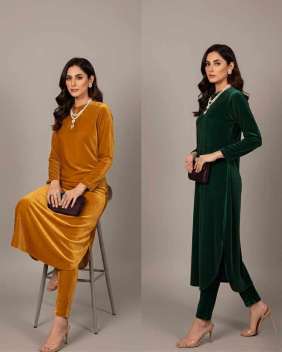 Be the first to review “Modest Premium Golden and Bottle Green Plain Velvet Long Straight Kurta Pant Set”