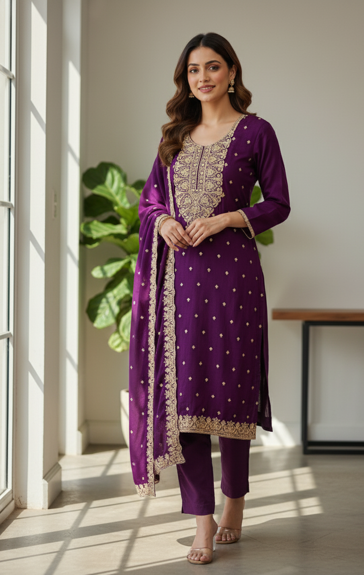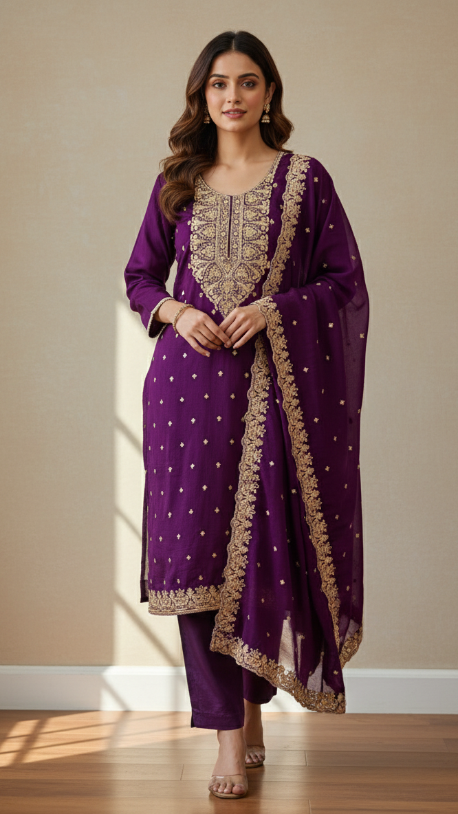 Premium Purple Organza Sequins & Thread Embroidery Kurta Set