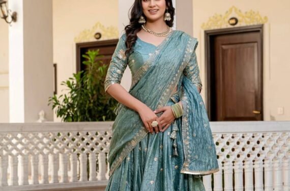 Be the first to review “Traditional Teal Gold Crush Embroidery Work with Canvas Lehenga Choli”