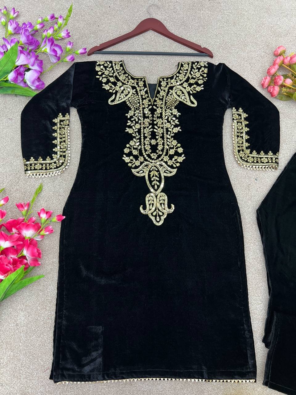 Zoya Black Viscose Velvet Heavy Embroidery Kurta & Bottom